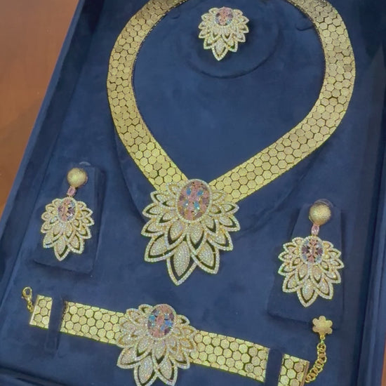 طقم مطلي ذهب بتفاصيل زركون لامعة وتصميم زهري أنيق يلفت الأنظار من أول لحظة.